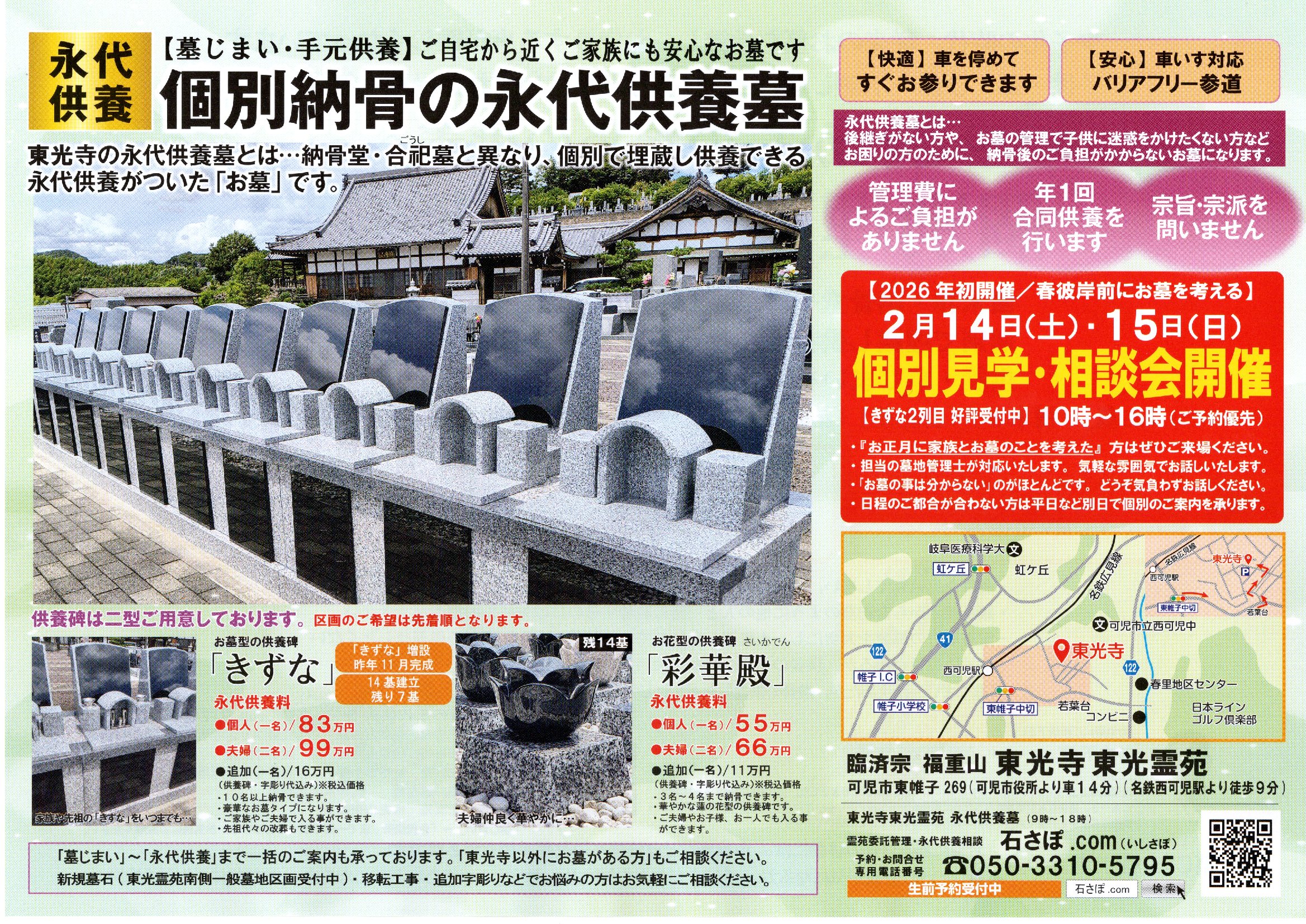 可児市東帷子(名鉄広見線「西可児」駅より車3分)「東光寺東光霊苑」に待望の個別埋蔵できる永代供養墓誕生 【彩華殿(さいかでん):全49基/きずな:全25基】